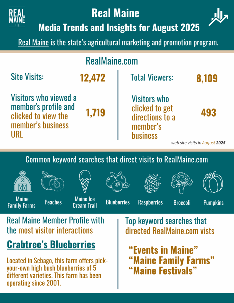 In August, more than 8,000 unique viewers visited the Real Maine website. 1,719 of these site visitors used the Real Maine website as an entry point to a farm or food business’s website. Nearly 500 people utilized a Real Maine member’s profile to get directions to that member’s business.